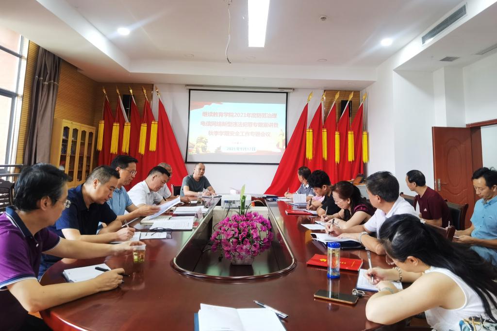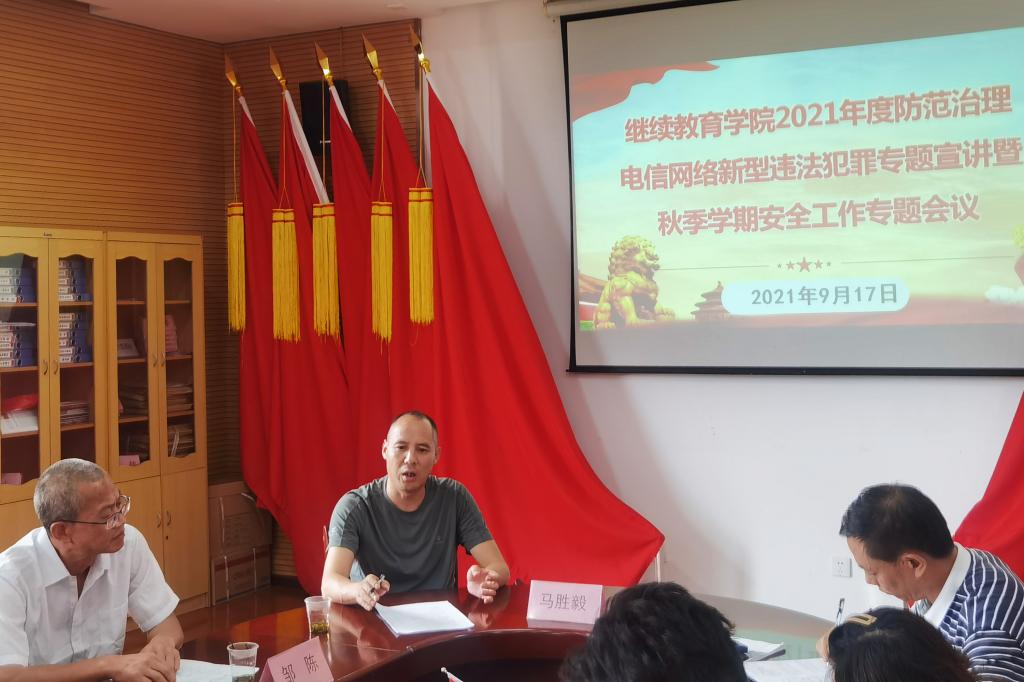 2021年9月17日下午,继续教育学院召开2021年秋季学期防范治理电信网络新型违法犯罪专题宣讲暨安全工作专题会议。会议由党总支书记周志辉主持,全体教职工参加会议,并邀请到学校电信网络防诈骗领导小组邹陈和马胜毅两位同志到会进行专题宣讲。