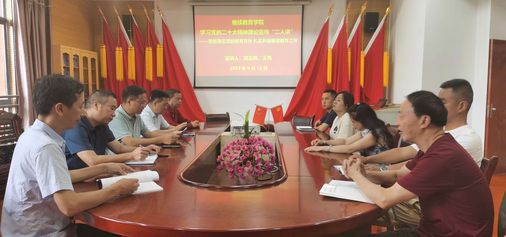 9月12日,继续教育学院党总支召开学习贯彻党的二十大精神理论宣传“二人讲”暨“党课开讲啦”活动。本次活动由继续教育学院党总支书记周志辉同志、继续教育学院党总支宣传委员王伟同志负责讲授,继续教育学院全体干部职工参加。