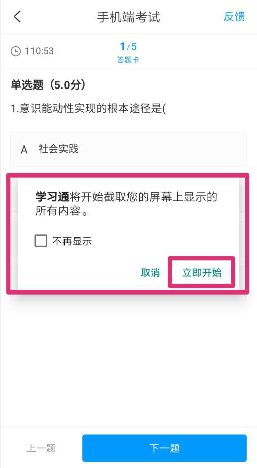 也可在首页-考试-考试列表端进入考试。进入考试之后会提示“学习通将开始截取您的屏幕上显示的所有内容”,考生需点击“立即开始”。