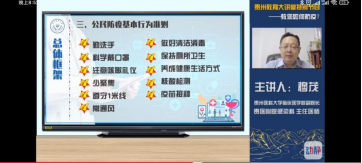 穆茂博士从修订过程、总体思路到实施过程,系统的为全省教育系统讲解了如何实施《新型冠状病毒肺炎防控方案(第九版)》。主要讲解以下三点:一是针对风险人员的隔离管理期限和方式,第九版防控方案提出,将密切接触者、入境人员隔离管控时间从“14天集中隔离医学观察+7天居家健康监测”调整为“7天集中隔离医学观察+3天居家健康监测”,解除集中隔离医学观察前不要求双采双检;将密接的密接管控措施从“7天集中隔离医学观察”调整为“7天居家隔离医学观察”。二是围绕封管控区和中高风险区划定标准,第九版防控方案将两类风险区域划定标准和防控措施进行衔接对应,统一使用中高风险区的概念,形成新的风险区域划定及管控方案。三是为进一步完善疫情监测要求,第九版防控方案明确,加密风险职业人群核酸检测频次,将与入境人员、物品、环境直接接触的人员核酸检测调整为每天1次,增加抗原检测作为疫情监测的补充手段。