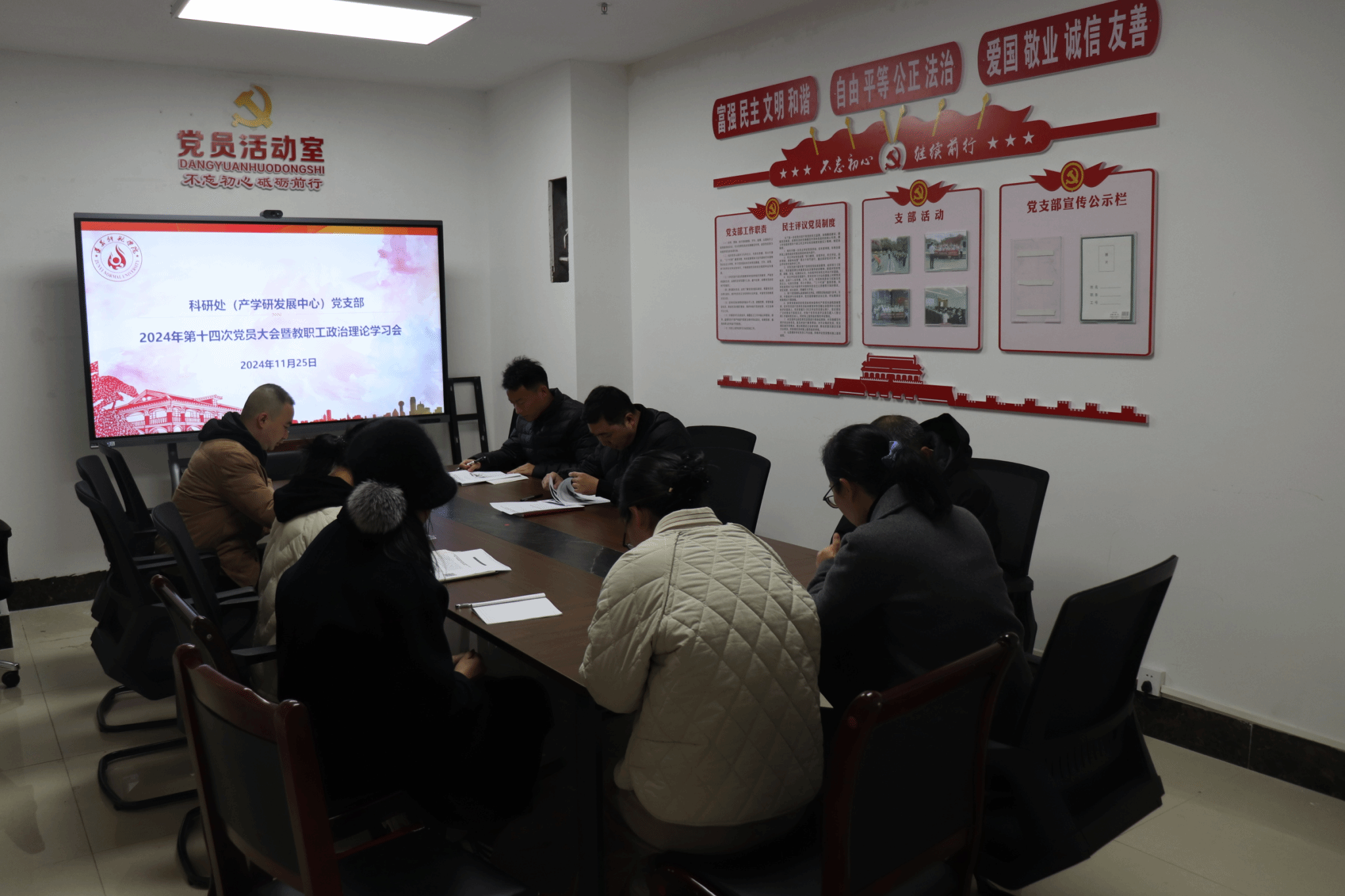 2024年11月25日,科研处(产学研发展中心)党支部在行政楼340会议室召开2024年第十四次党员大会暨教职工政治理论学习会。会议由高智席同志主持,科研处、产学研发展中心全体职工参加会议。