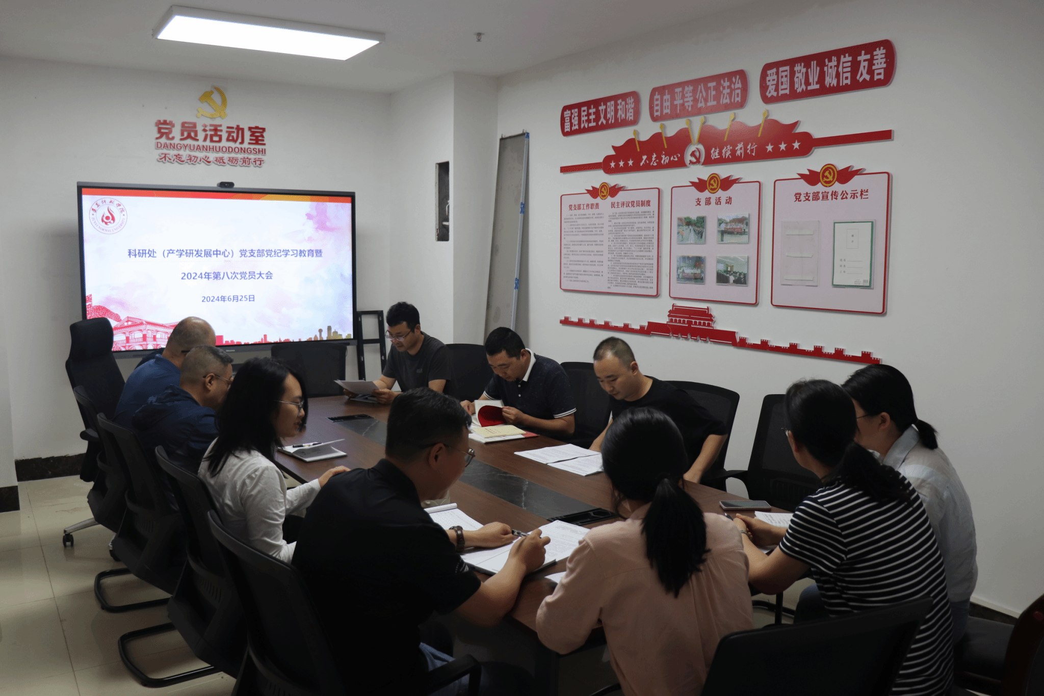 2024年6月25日,科研处(产学研发展中心)党支部在行政楼340会议室召开党纪学习教育暨2024年第八次党员大会。会议由高智席同志主持,科研处、产学研发展中心全体职工参加会议。