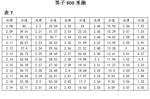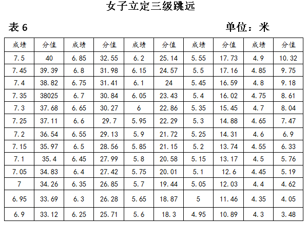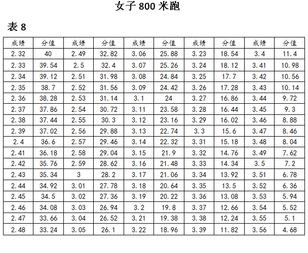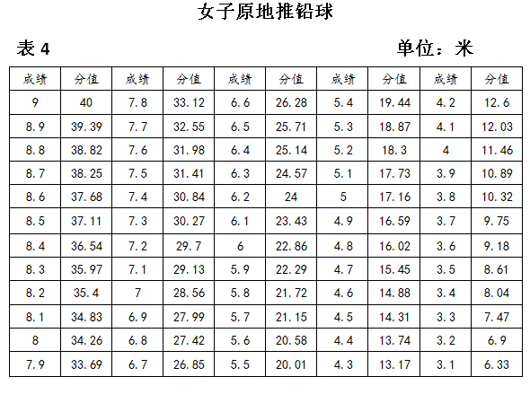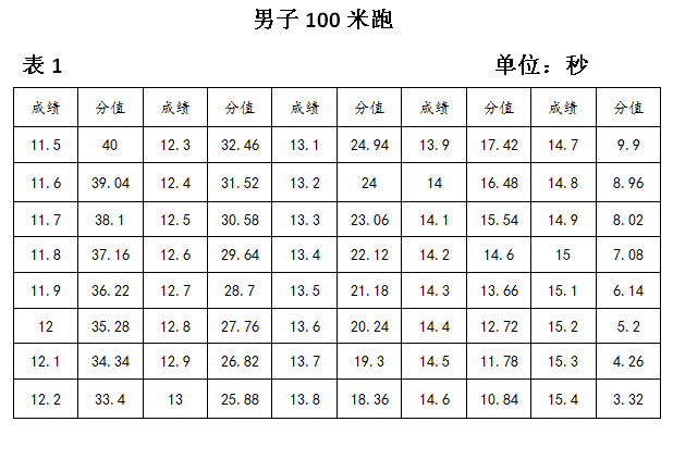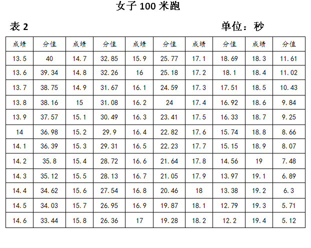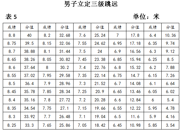 评分标准:按省体育统考相关要求执行(各项评分标准详见附件),每项分值40分,总分160分(预录取时折算为100分的分值)。