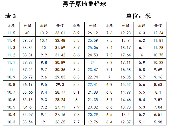 测试项目:100米跑、原地推铅球(男生5kg、女生4kg)、立定三级跳、800米跑