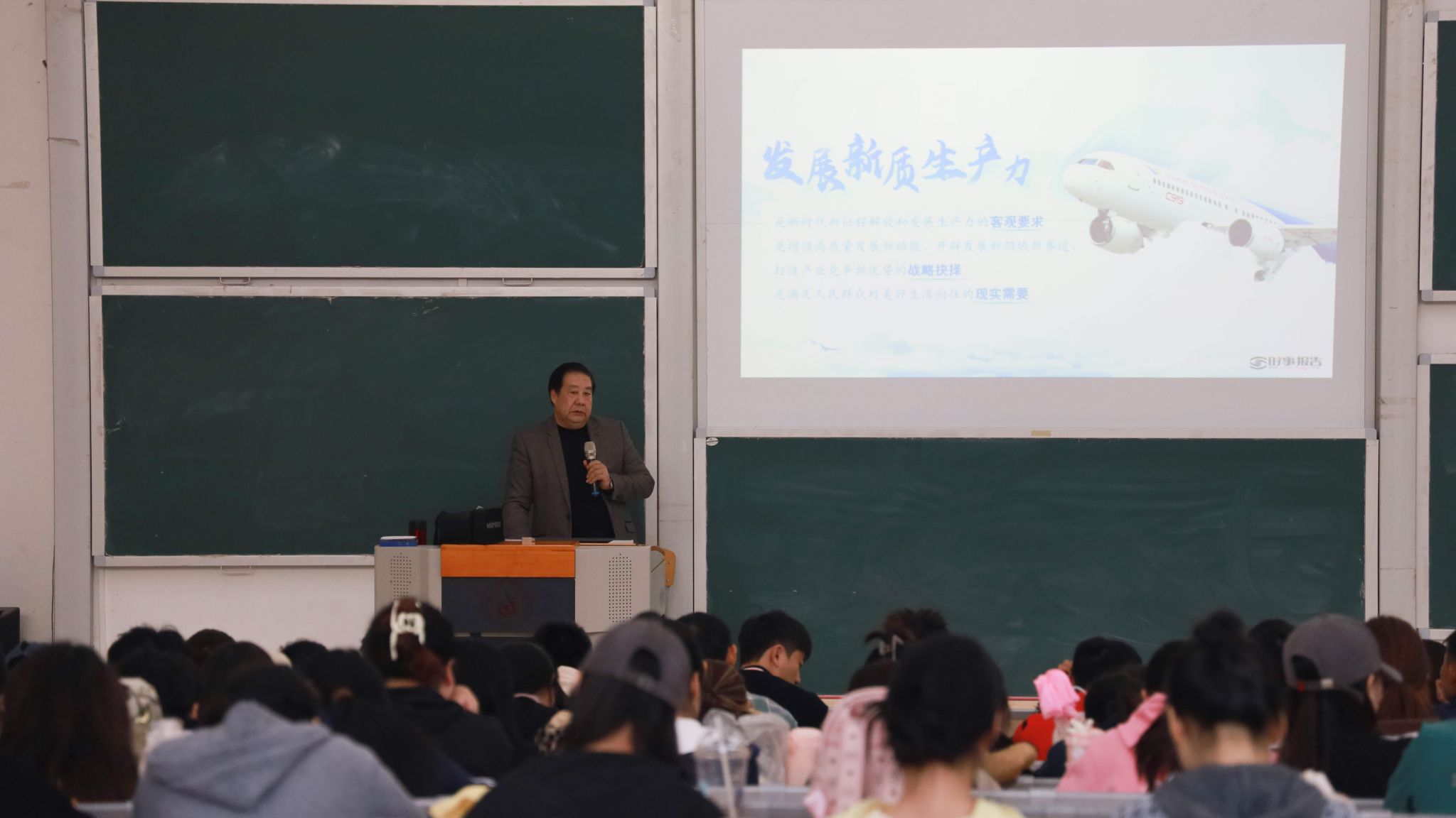 本网讯(文/施宣 图/苟晓芳) 10月23日下午,学校党委委员、副校长胡贵勇在执闳楼107教室讲授题为《加快发展新质生产力》的思政课。24级社体专升本班、24级舞编专升本(1)班、24级舞编专升本(2)班、24级音表专升本(1)班、24级音表专升本(2)班学生到场聆听。