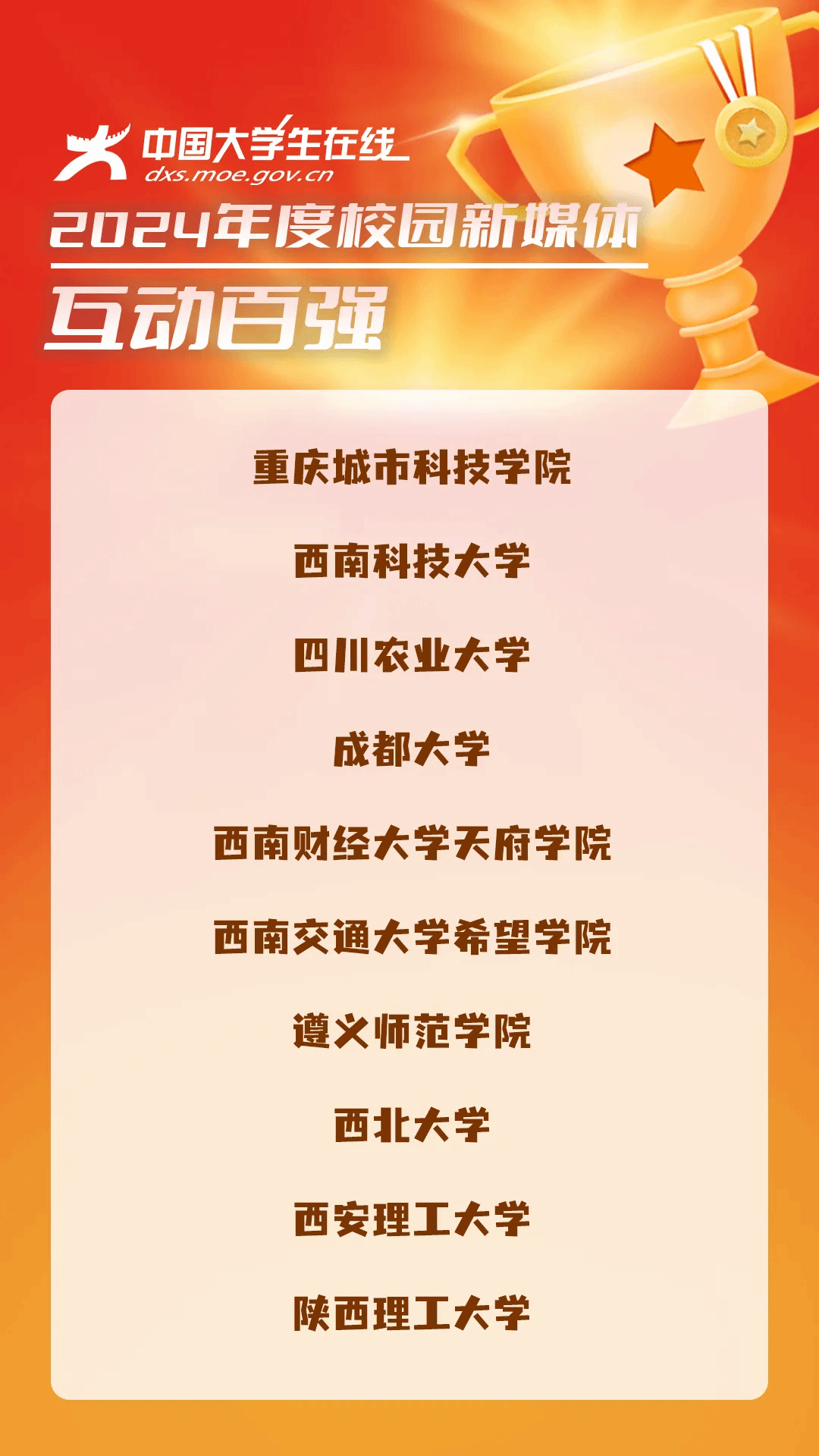 本网讯(施宣) 12月26日,教育部中国大学生在线公布2024年度校园新媒体表彰名单,微信买球官方网站入选“校园新媒体互动百强”(贵州仅1所高校入选)。这是学校第三次入选年度“校园新媒体互动百强”。