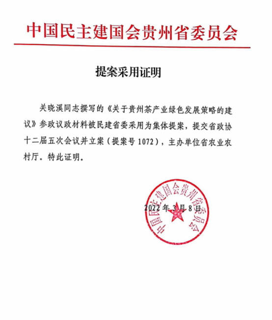 民建会员关晓溪的《关于推动贵州辣椒产业集群优化的策略建议》参政议政材料被民建贵州省委采用为集体提案,提交贵州省政协十二届四次会议并立案;《关于贵州茶产业绿色发展策略的建议》的提案获民建贵州省委采纳为集体提案,并提交了贵州省政协十二届五次会议并立案;撰写的《产学研背景下农业科技助推创新发展——以微信买球官方网站为例》获民建遵义市委调研课题优秀成果。