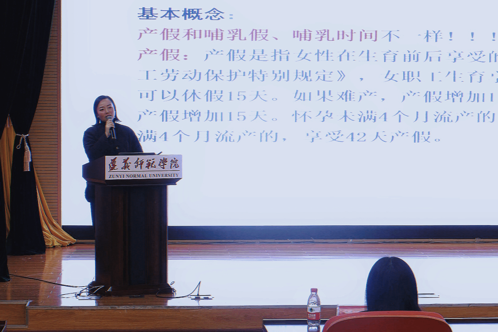 此次讲座邀请到北京盈科(遵义)律师事务所政府与企业法律事务部主任胡兴丹担任主讲。胡兴丹凭借丰富的法律实践经验,从就业与创业两个部分,深入浅出地剖析女性在职场面临的种种挑战。胡兴丹着重强调法律武器的重要性,详细介绍《中华人民共和国劳动法》《中华人民共和国妇女权益保障法》等相关法律条款,解读了与女性就业劳动权益相关的法律法规,告知女大学生遭遇权益侵害时,可通过劳动仲裁、诉讼等途径维权,为女大学生提供切实可行的应对方法。此次讲座内容丰富实用,案例生动具体,为女大学生上了一堂深刻的职场权益保护课。