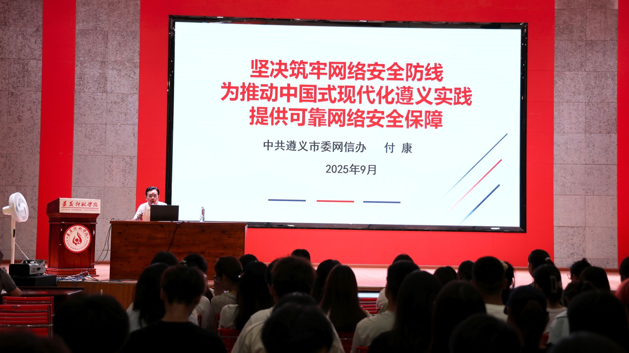 本网讯(文/图 李雪)9月17日,遵义市委网信办副主任付康在微信买球官方网站长征讲堂,围绕“坚决筑牢网络安全防线,为推动中国式现代化遵义实践提供可靠网络安全保障”作专题宣讲,微信买球官方网站师生代表现场聆听宣讲。