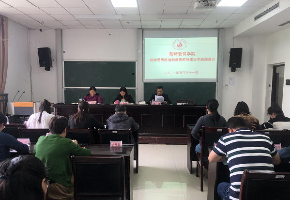 本次会议旨在全面推进教师思想政治和师德师风建设工作方面提高认识,统一思想,明确方向,以“学百年党史,育时代新人”为主题,会议从教师教育学院实际出发,部署了狠抓教师思想政治和师德师风建设重点任务,师德专题教育正式启动。