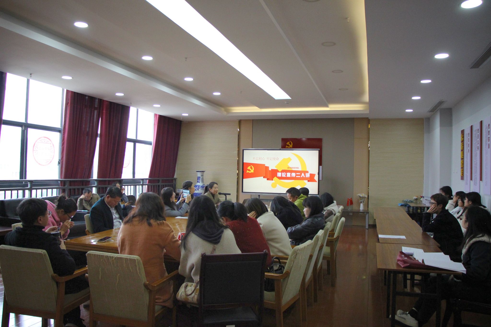 2023年12月8日,教师教育学院开展第四期理论宣传二人讲——“学习党的二十大 推进大统战”,党外人士、青年教师及少数民族师生代表40余人参加,本次讲座由党委统战委员李章琼同志主持,党委书记王洪叶同志出席。