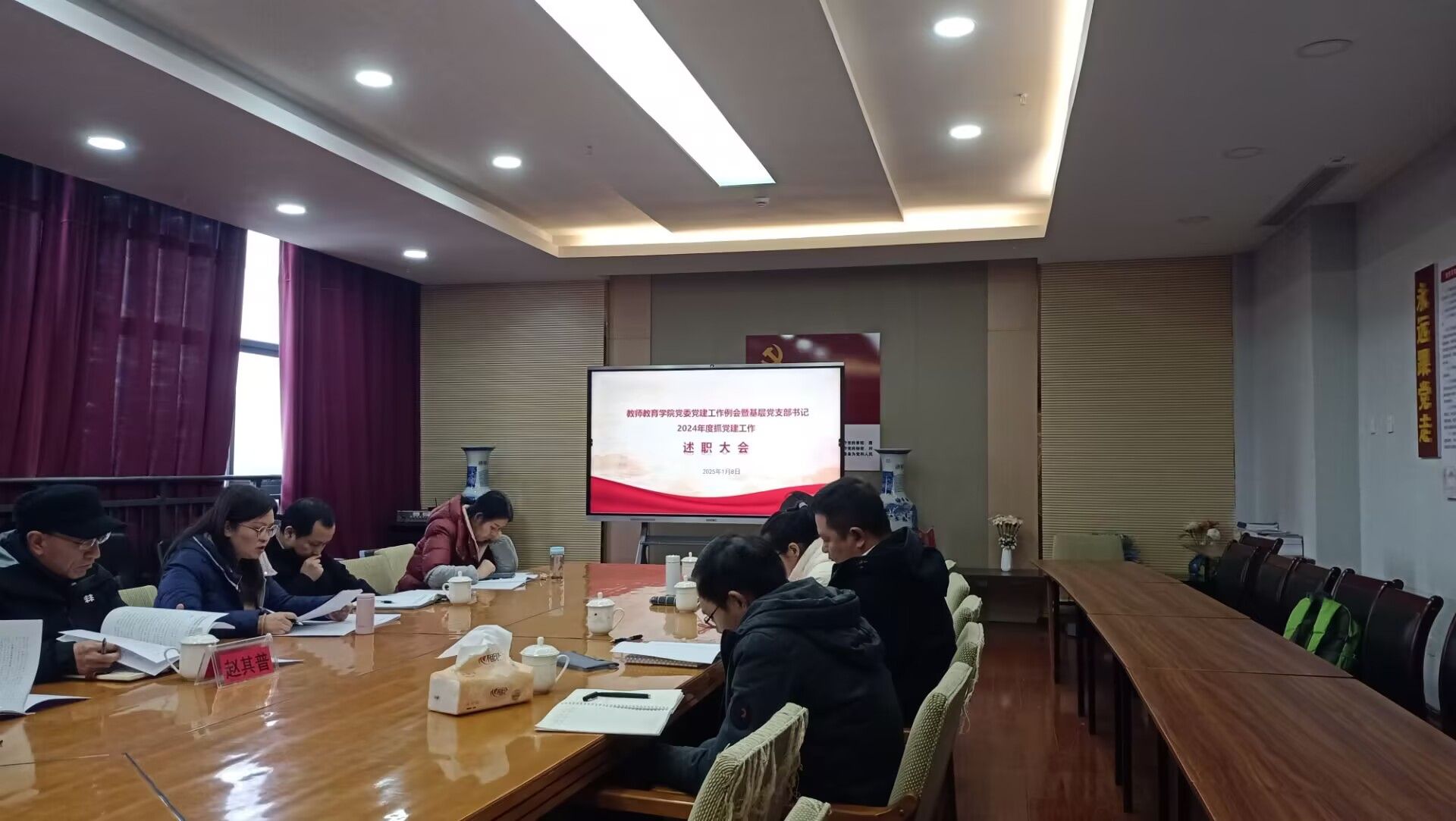 2025年1月8日,教师教育学院党委在执毓楼319会议室召开党建工作例会暨2024年度基层党支部书记抓党建工作述职大会。学院党委班子成员、各党支部书记、支部委员、党员代表和相关职能部门负责人参加会议,学校考核评议工作指导组组长赵其普列席指导会议,学院党委副书记李章琼主持会议。
