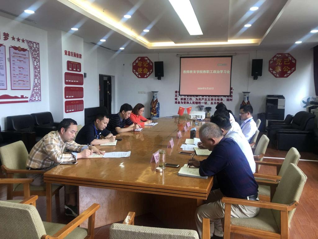 2020年5月22日14点,教师教育学院召开2020年第二次政治学习会。因疫情原因,采取线上线下同时召开的形式进行政治学习。学院领导班子成员、各科室副科长以上干部在执毓楼319会议室主会场,其余教职工使用“腾讯会议”(会议ID:333175460)参加网络会议。参加会议的有:教师教育党总支书记秦进、副书记、院长朱海、心理健康咨询中心主任罗永忠、党总支副书记吴昌权、副院长王文乔、副院长张远强以及全院教职工。会议由秦进书记主持。