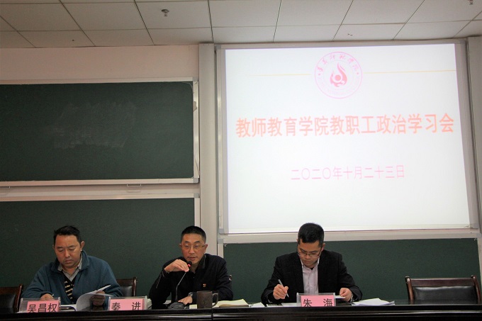 2020年10月23日14点,在执毓楼103会议室,教师教育学院召开2020年第八次教职工政治学习会。参加会议的有:教师教育学院党总支书记秦进、党总支副书记、院长朱海、党总支副书记吴昌权以及全院教职工。会议由秦进书记主持。