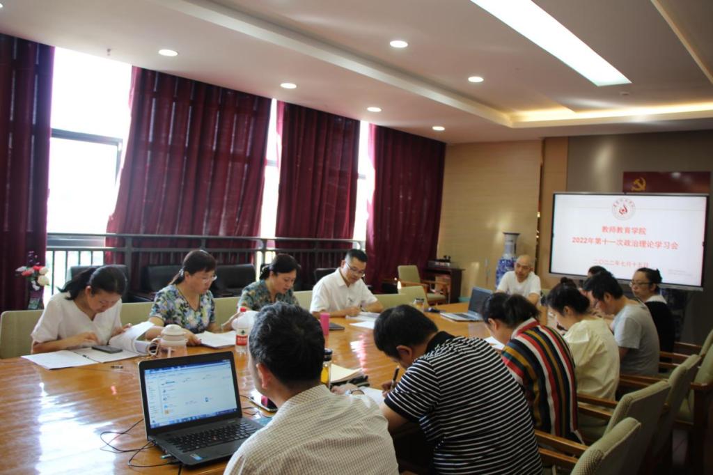 7月15日上午,教师教育学院在执毓楼319会议室组织召开2022年第十一次政治理论学习会,会议采取线上与线下方式进行,党委副书记朱海同志主持,全院教职工参加。