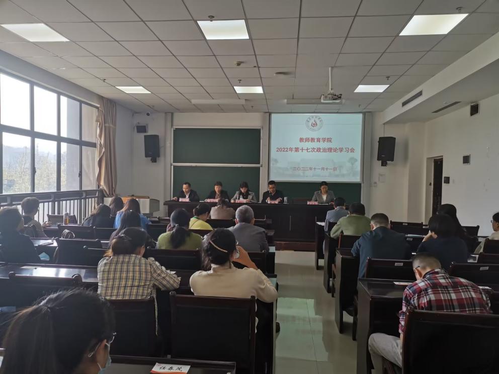 11月11日下午,教师教育学院在执毓楼103组织召开2022年第十七次政治理论学习会,会议由党委书记王洪叶同志主持,全院教职工参加。