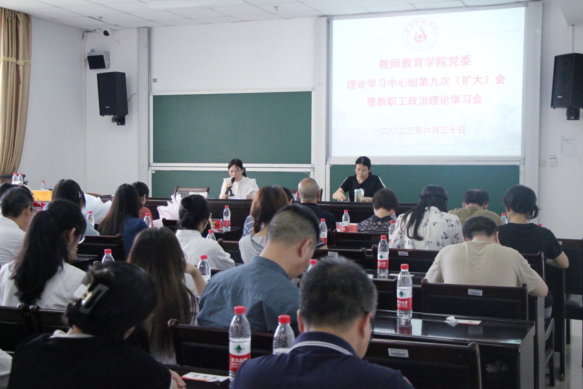 2023年6月30日下午,教师教育学院党委理论学习中心组第九次(扩大)会暨教职工政治理论学习会在执毓楼103会议室举行,会议由党委书记王洪叶同志主持,全体教职工参加。