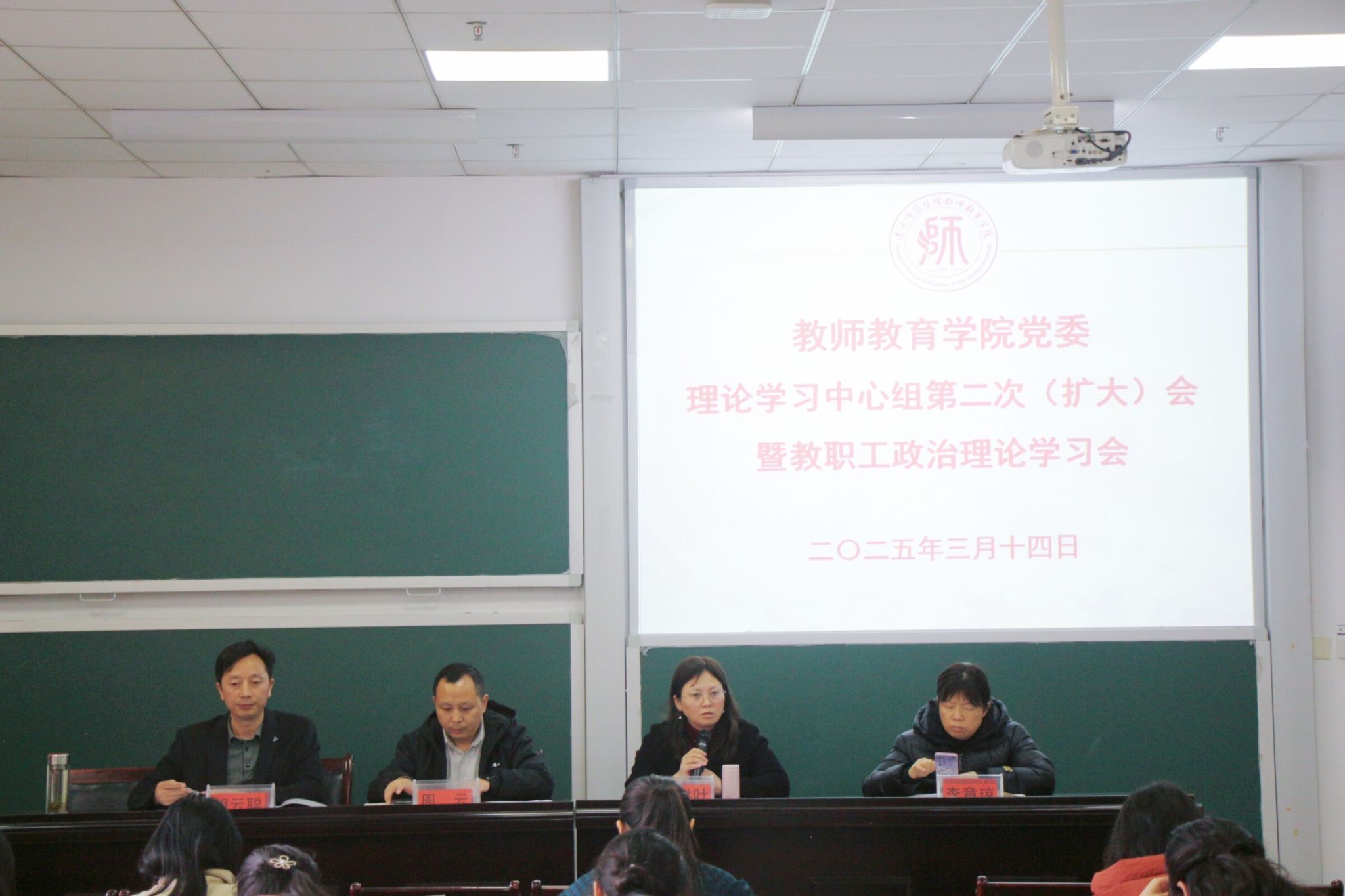 教师教育学院于2025年3月14日在执毓楼103会议室召开党委理论学习中心组第二次(扩大)会暨教职工政治理论学习会。会议由教师教育学院党委书记王洪叶主持,全体教职工参加。