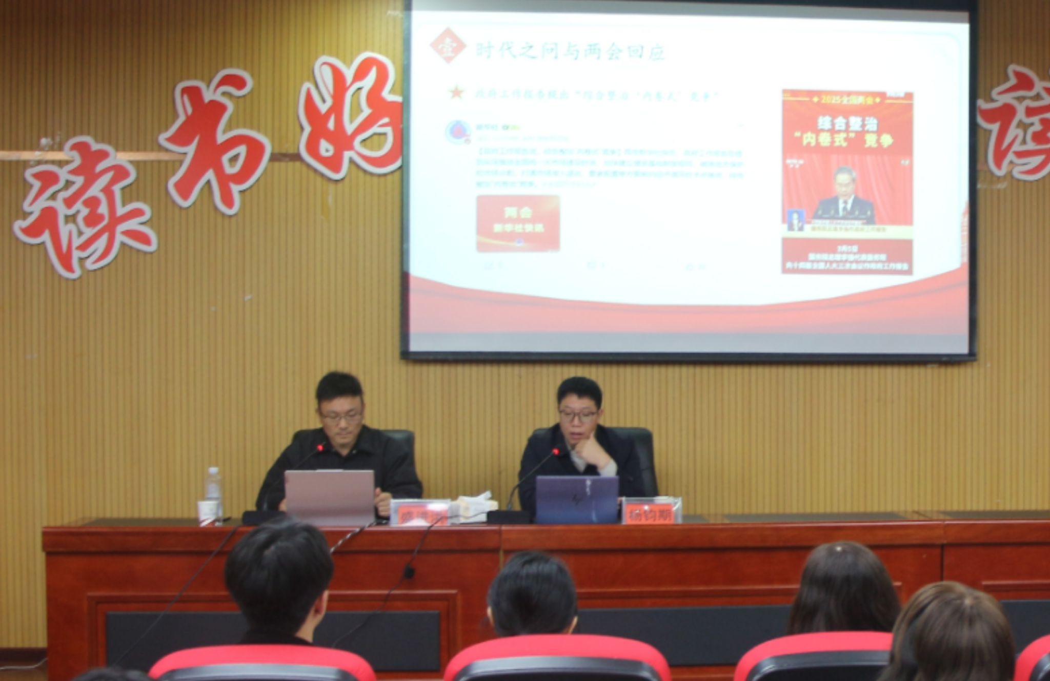 杨钧期与盛进洪以“打破内卷困局,重塑竞争新生态——学习2025年全国‘两会’精神”为题展开了精彩宣讲。两位老师通过理论与实践的结合,深入解读全国“两会”精神,引导师生深刻领会全国“两会”精神核心要义。他们剖析了社会内卷的本质与危害,分享了破局“内卷式”竞争的实践探索路径,极大激发了师生跳出“内卷”思维的主动性,帮助大家树立正确的竞争观念。