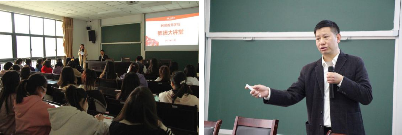 11月14日下午,教师教育学院“毓德大讲堂”系列讲座之《立足当下、展望未来,踔厉前行》在执毓楼103会议室举行。本次讲座主讲人为凤冈县天桥镇中心学校校长郑军。天桥镇中心完小校长郑晓成、天桥镇中心学校佘定贵老师、小学教育教研室老师以及21级小学教育专业全体学生参加了此次讲座。