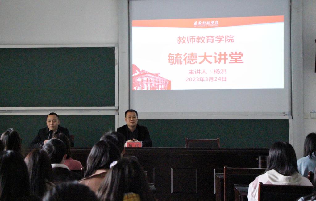 为进一步加强小学教育国家一流专业建设工作,持续提升小学教育专业的人才培养质量,2023年3月24日下午,教师教育学院在执毓楼103开展“毓德大讲堂”系列专题讲座活动,教师教育学院小学教育专业近百名学生参加。本次活动由教师教育学院副院长周云主持。