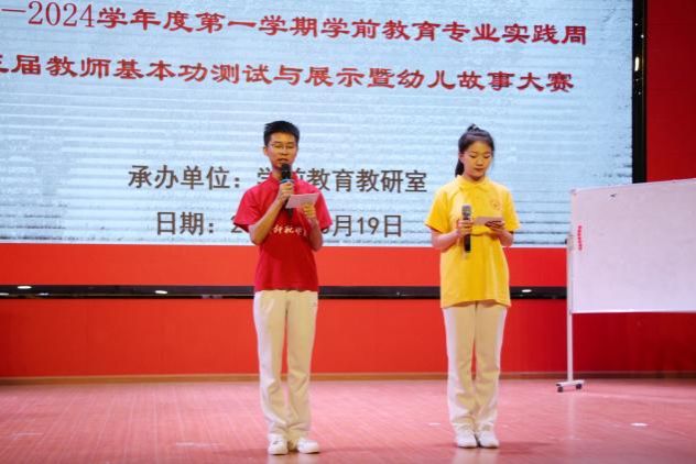 教师教育学院于2023年10月19日上午在长征讲堂举行2023-2024学年度第一学期学前教育专业实践周第三届教师基本功测试与展示暨幼儿故事大赛。微信买球官方网站教师教育学院党委书记王洪叶,副院长韦文华,副院长王文乔,副院长李章琼出席本次大赛。教师教育学院教师田伟力、李垣锦、冯远宇、吴志勤、秦建勋、任春茂、周颖担任本次大赛评委,学前教育教研室全体教师以及22级学前教育专业全体学生参加。本次大赛由王林和杨怡婷两位同学主持。