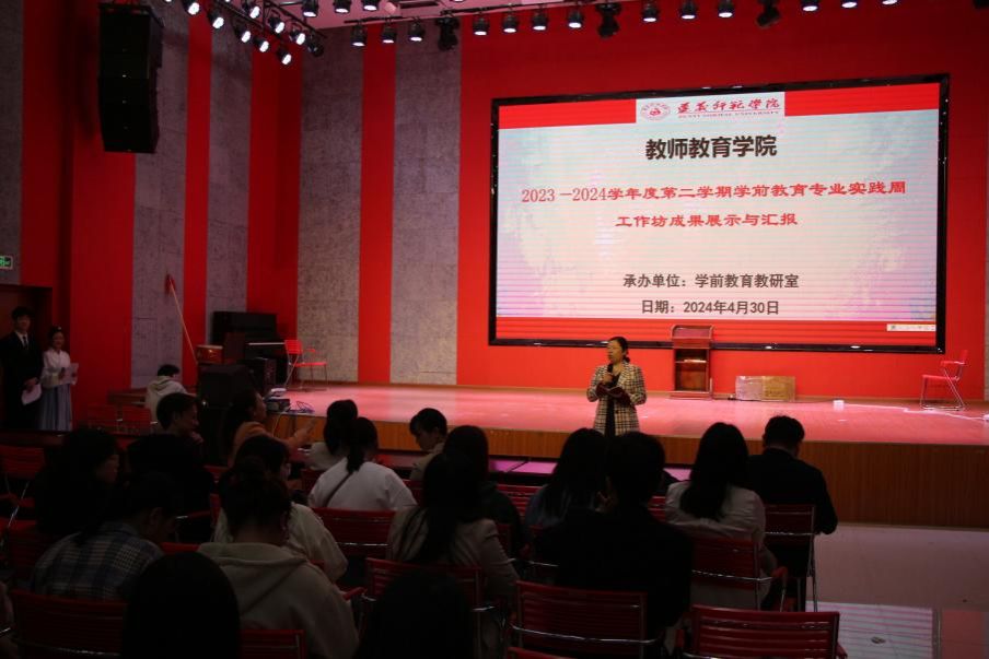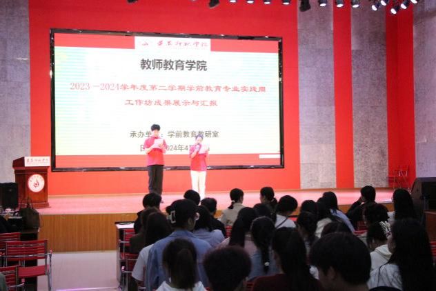 2024年4月30日午,教师教育学院在学生中心长征讲堂举行2023–2024学年度第二学期学前教育专业实践周工作坊成果展示与汇报,汇报现场精彩纷呈,气氛活跃!