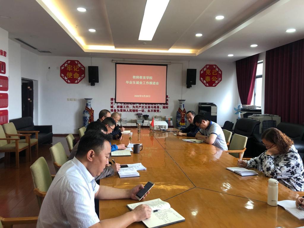 2020年5月29日上午10点,在执毓楼319会议室召开教师教育学院毕业生就业工作推进会。参加会议的有:教师教育党总支书记秦进,副书记、院长朱海、心理健康咨询中心主任罗永忠、党总支副书记吴昌权、副院长张远强、科室长及教师代表。会议由秦进书记主持。