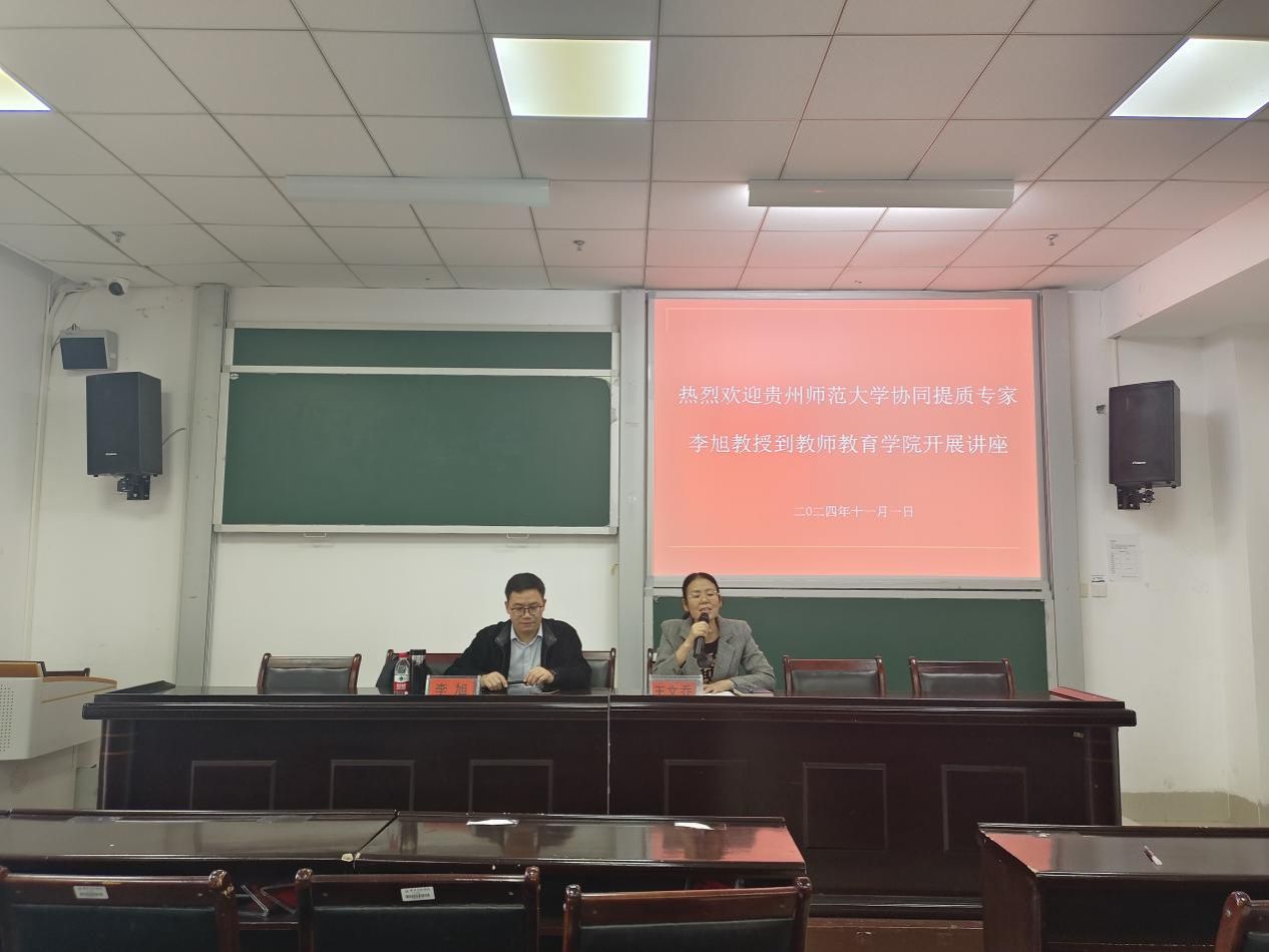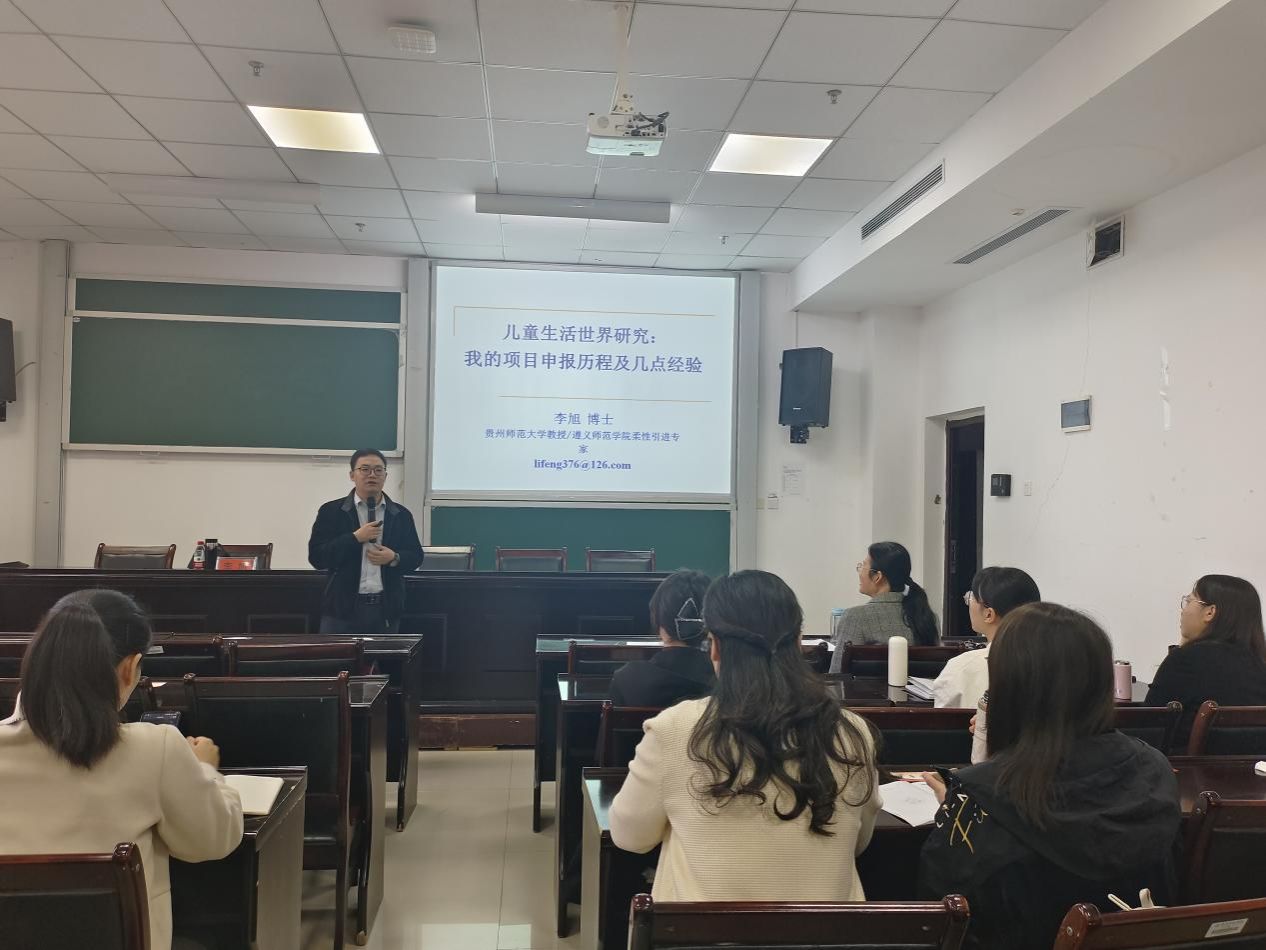 为响应学校关于国家级课题申报的要求,教师教育学院在启动国家级课题申报工作后,分步骤、分阶段、有计划、有系统地推动相关工作开展。当前是教师进行国家级课题选题的重要时期,2024年11月1日,我院特邀请贵州师范大学协同提质专家李旭教授在执毓楼103教室为我院教师开展题为《儿童生活世界研究:我的项目申报历程及几点经验》的讲座,教师教育学院全体教师参加此次讲座。讲座由王文乔副院长主持。