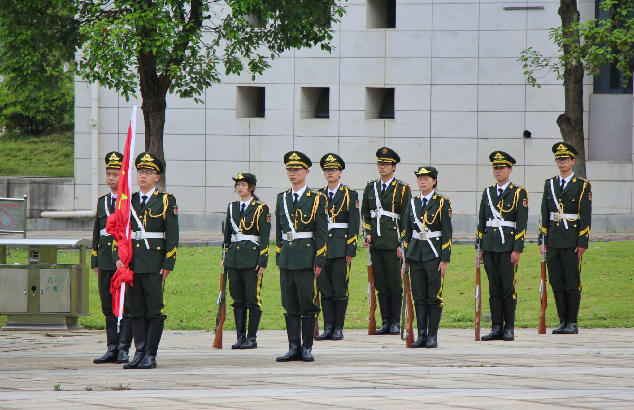 仪式中,国旗护卫队队员们昂首阔步,步伐坚定有力,以无比庄重的姿态护送五星红旗进入广场中央,在激昂高亢、响彻云霄的国歌声中,鲜艳夺目的五星红旗缓缓升起,全场师生庄重伫立,面向国旗致以最崇高的敬意。