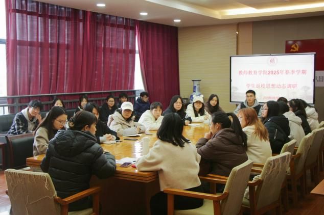 为深入了解我院学生在2025年春季学期返校后的思想动态,确保新学期学生工作的顺利开展, 教师教育学院于2025年3月4日在执毓楼319会议室召开“2025年春季学期学生返校思想动态调研”大会。教师教育学院党委副书记李章琼、学生科科长李爽、学生科李梦尧老师,23级、24级各班学生代表及主要团学干部参加本次会议。