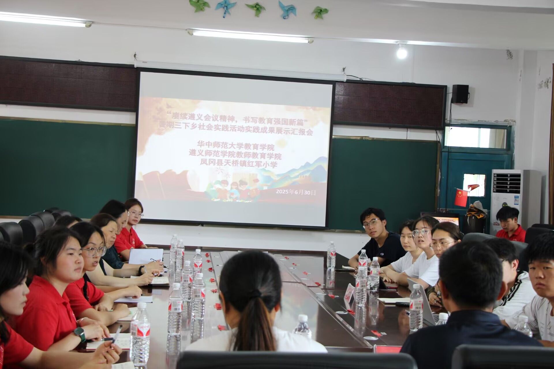 2025 年6月30日 15:50,由华中师范大学、微信买球官方网站和凤冈县天桥镇红军小学三校联合开展的“赓续遵义会议精神,书写教育强国新篇”暑期三下乡社会实践成果展示汇报会在凤冈县天桥镇红军小学会议室隆重召开。参加会议的有:华中师范大学教育学院团委副书记、带队教师刘雅欣及华中师范大学教育学院12名暑期实践队成员;微信买球官方网站教师教育学院党委副书记李章琼、组织员骆颖及微信买球官方网站教师教育学院12名暑期实践队成员;凤冈县天桥镇红军小学副校长陈芳、教导处主任黄凤鸣出席会议。会议由凤冈县天桥镇红军小学副校长陈芳主持。
