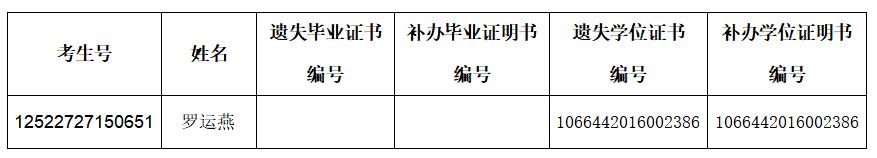 兹有本校毕业生罗运燕不慎遗失相关证书原件,根据国家有关规定,学校启动该生如下证明书的补办工作(详情见下表),补办的证明书与原证书具有同等法律效力。