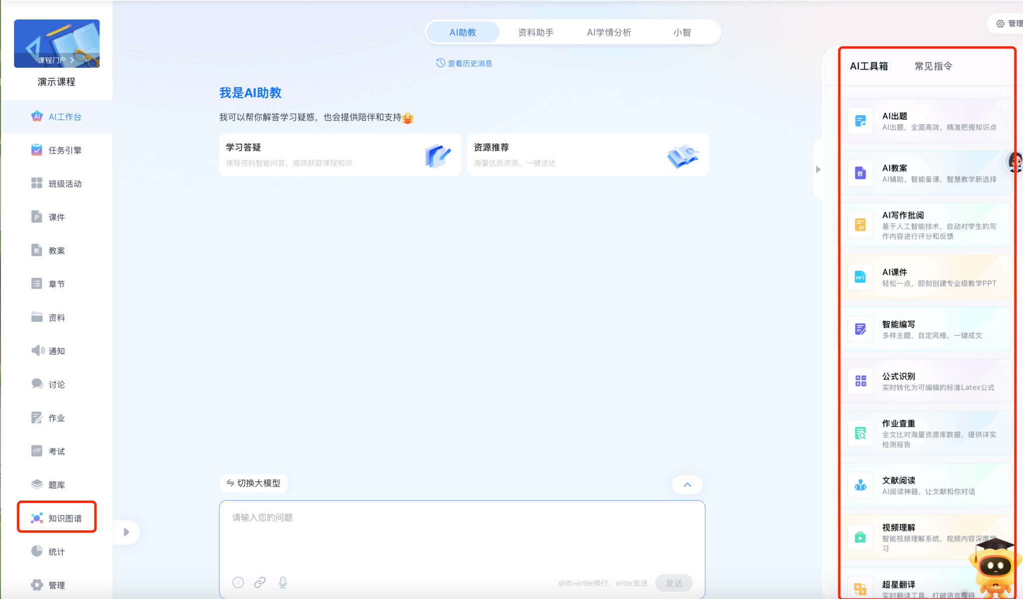 教师和学生可以通过平台体验一站式教学AI工作台,将DeepSeek大模型“深度思考”与“联网搜索”与课程专属知识库相结合,平台提供知识图谱、AI出题、AI教案、AI课件、AI写作、公式识别、智能编写等多项工具,为教师提供贯穿课前、课中、课后的全流程AI赋能,提升教学质量和学习效率。
