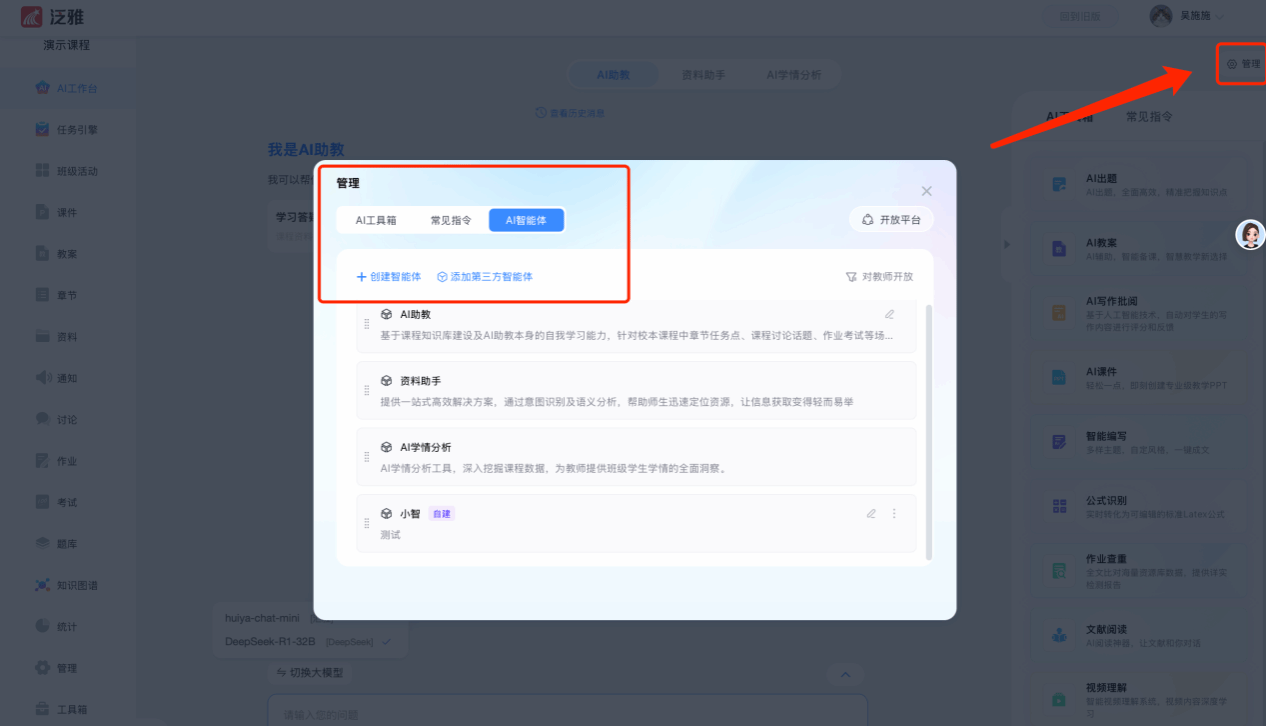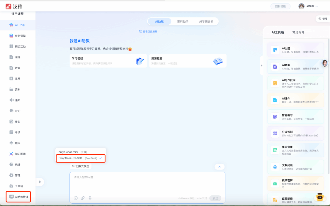 教师打开所授课程/学生打开所学课程,点击“AI工作台”即可与课程专属AI助教进行教学互动,支持随意切换DeepSeek大模型进行深度思考。