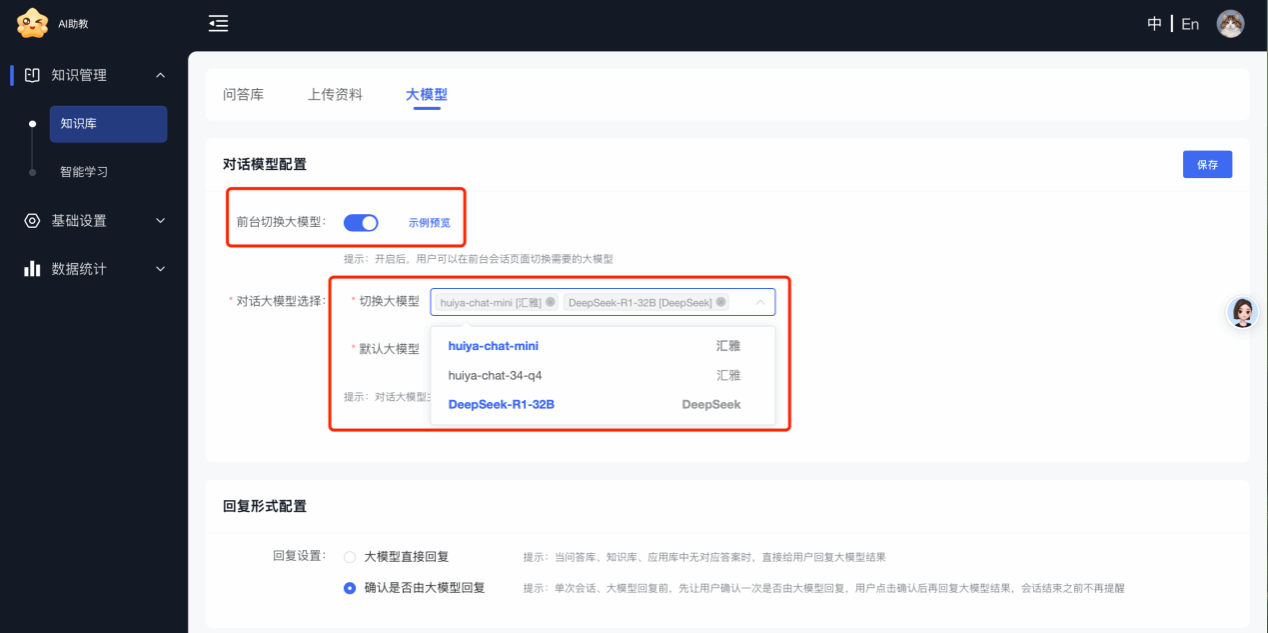 【温馨提示】教师开通切换大模型设置路径:在所授课程左下方菜单栏点击“AI助教管理”-“大模型”模块-开启“前台大模型”-并选择适用的大模型,点击“保存”。