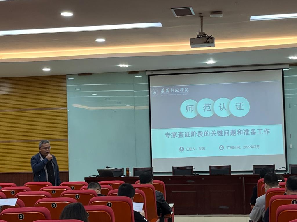 党支部书记、教务处处长吴波以“专家查证阶段的关键问题和准备工作”为题,从“师范认证的主线和底线、人才培养方案的制定、课程教学的基本规范和执行、自评报告的内容和逻辑、专家座谈和访谈的关注点”等五个方面详细介绍了师范专业认证的重要性和紧迫性,强调了自评报告的撰写方法及专家访谈的相关注意事项。