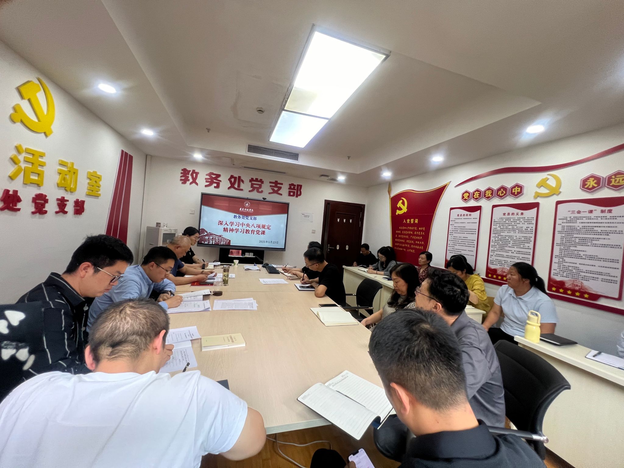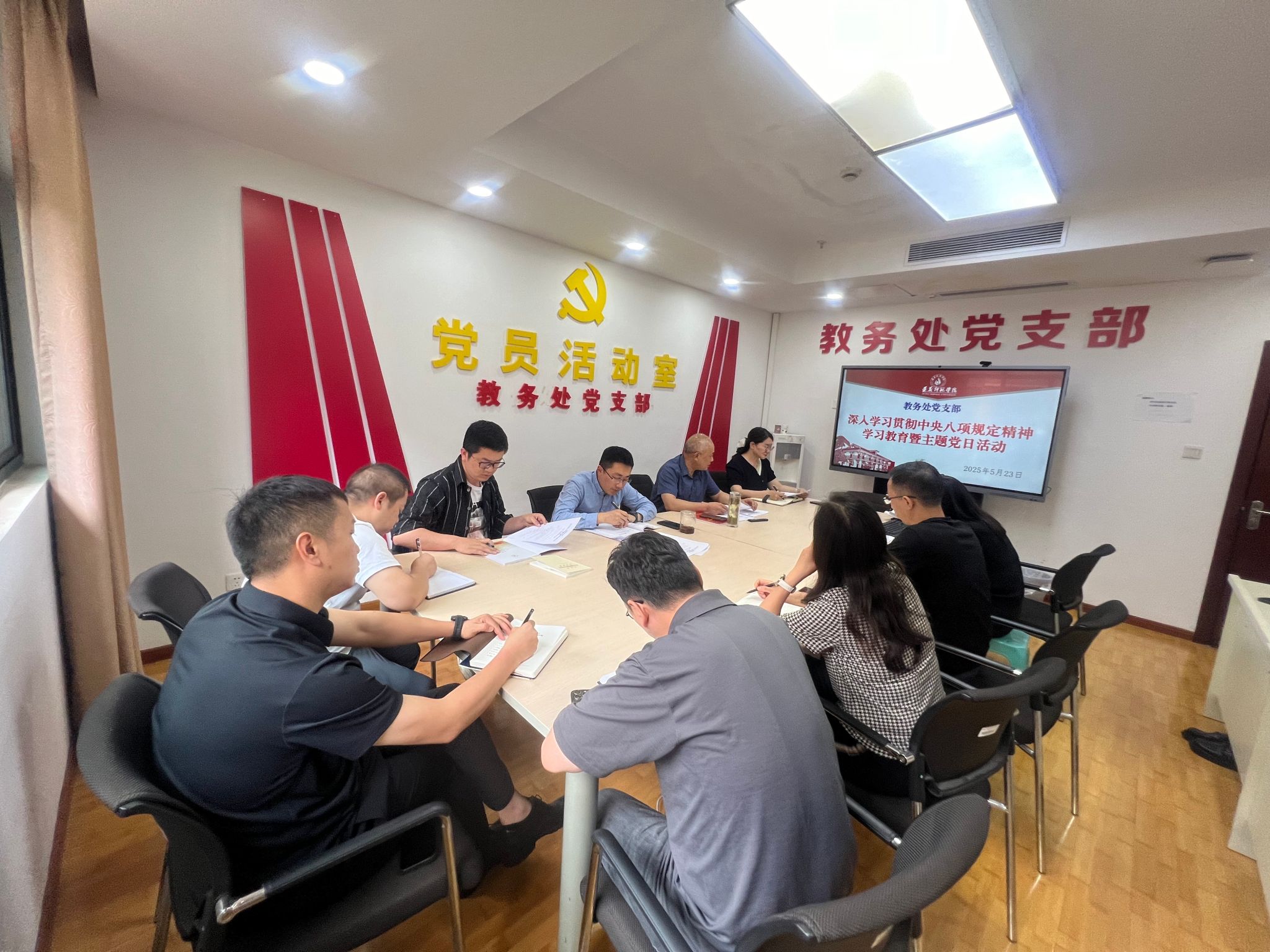 5月23日下午,教务处党支部在行政楼227办公室开展了深入贯彻中央八项规定精神学习教育暨主题党日活动。教务处、教学质量监测与评估办公室全体教职工参会,活动由教务处党支部副书记张远强主持。