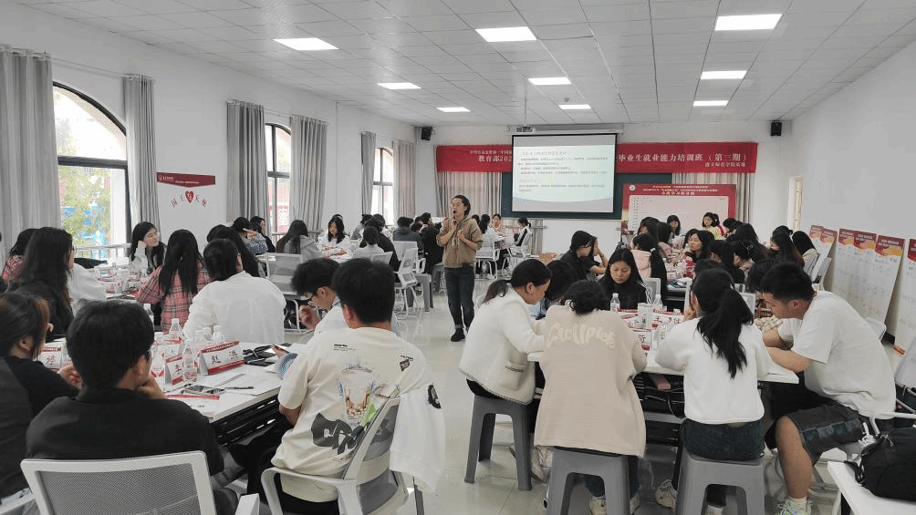 本次培训在遵义医科大学医学与科技学院行政楼2楼语音实验室三教室进行,参训学员是来自遵义医科大学护理学、公共事业管理、英语专业的学生。本次培训融入AI技术,通过8个标准模块、2个特色模块的教学,帮助学生运用AI工具梳理个人优势、探索政策与行业趋势、明确职业定向、提高简历制作和面试表达能力,课堂氛围活跃,师生互动频繁。