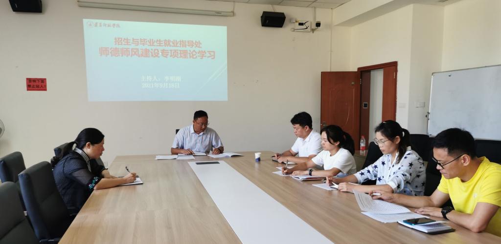 为深入贯彻落实教育部等七部门印发的《关于加强和改进新时代师德师风建设的意见》,以及《新时代高校教师职业行为十项准则》《省教育厅关于实施“强师工程”的意见》《贵州省师德师风建设专项行动实施方案》《微信买球官方网站加强师德师风建设实施意见》等文件精神,进一步强化师德师风建设成果,2021年9月18日上午10:00,在学生中心419室,招生与毕业生就业指导处全体教职工开展了第一次的师德师风建设专项理论学习。