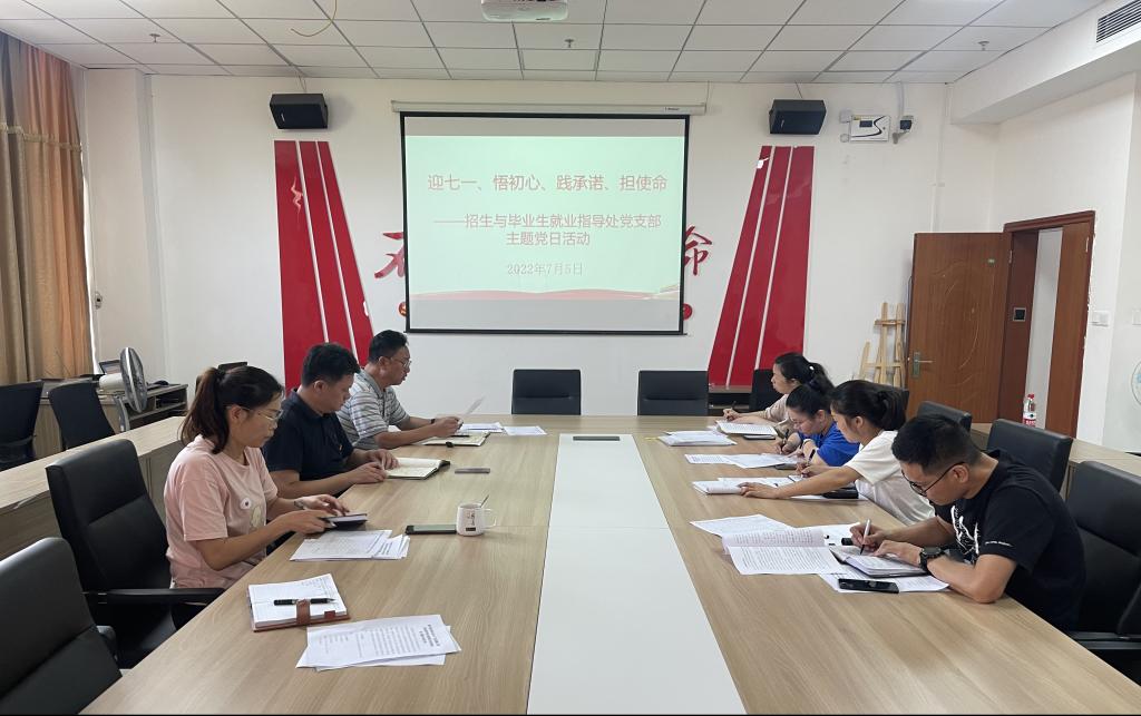 2022年7月5日上午,招生与毕业生就业指导处党支部在学生中心419会议室开展了2022年7月主题党日活动。本次主题党日活动主题为“迎七一、悟初心、践承诺、担使命”,活动由支部书记李明刚同志主持,本支部党员参加,非党员列席。