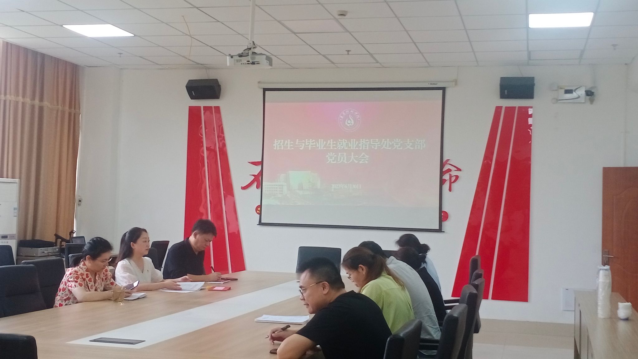 2023年6月30日,招生与毕业生就业指导处党支部在学生中心大楼419会议室召开党员大会,招就处党支部全体党员同志参加会议,非党员列席会议。会议由李静书记主持。