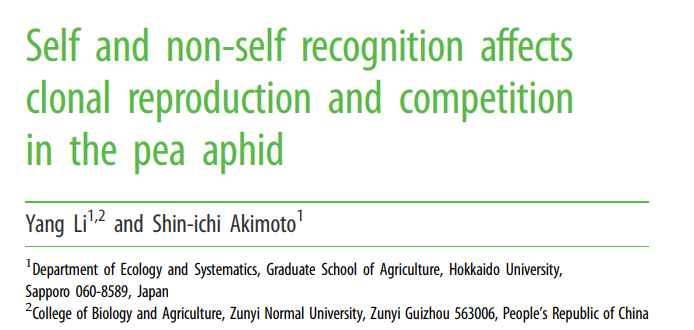 近日,买球生物与农业科技学院(食品科技学院)李杨博士(副教授)与日本国立北海道大学秋元信一教授合作的最新研究成果“Self and non-self recognition affects clonal reproduction and competition in the pea aphid” 在线发表在权威生物学综合性期刊Proceedings of the Royal Society B: Biological Sciences(简称Proceedings B)上。Proceedings B是生物学的TOP期刊,也是全球82个自然指数(Nature Index)期刊之一。