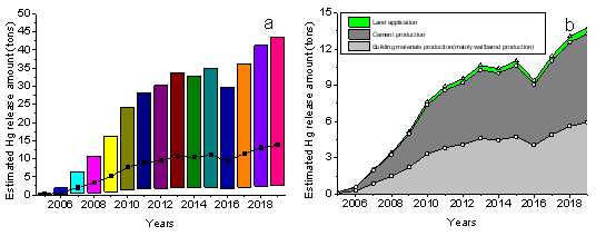 Fig. 2脱硫石膏资源化利用过程中的(a)汞释放总量(b)不同资源化利用途径的汞释放量的年份变化