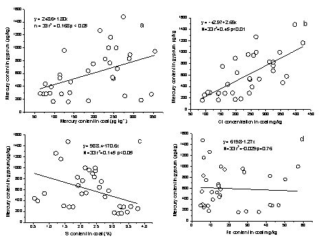 Fig.1脱硫石膏Hg含量与燃煤(a) Hg含量, (b) Cl含量, (c) S含量(d) Fe含量的相关性