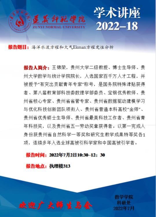 学术讲座2022-18:海洋水波方程和大气Ekman方程定性分析