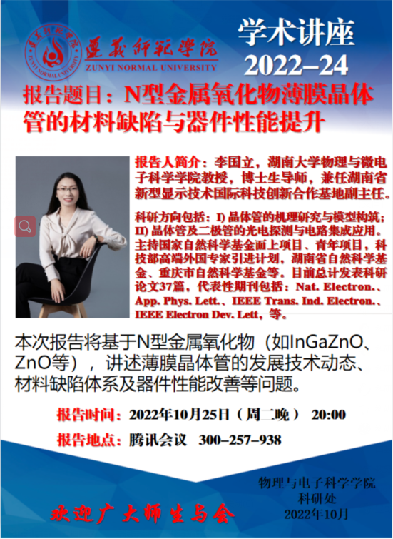 学术讲座2022-24:N型金属氧化物薄膜晶体管的材料缺陷与器件性能提升