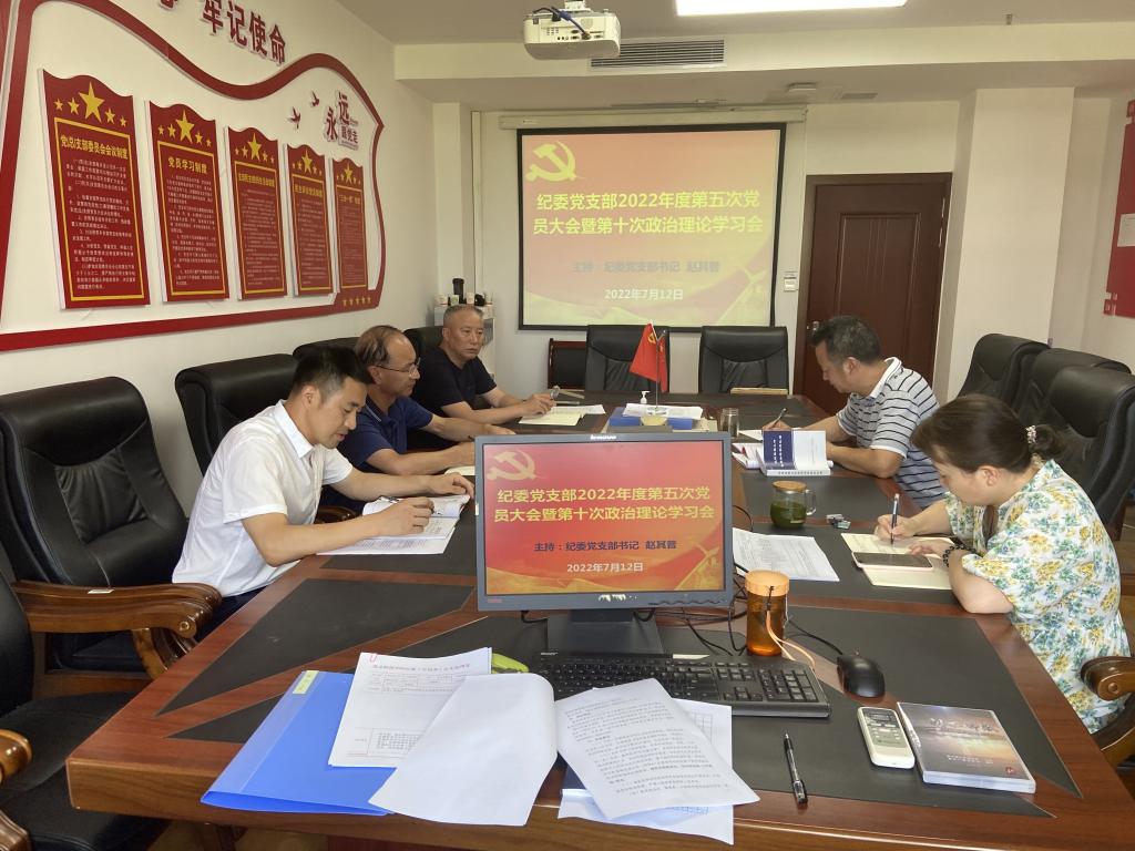 2022年7月12日上午,纪委党支部在行政楼413会议室开展2022年度第五次党员大会暨第十次政治理论学习会。党支部书记赵其普主持会议,全体纪检监察干部参加学习。