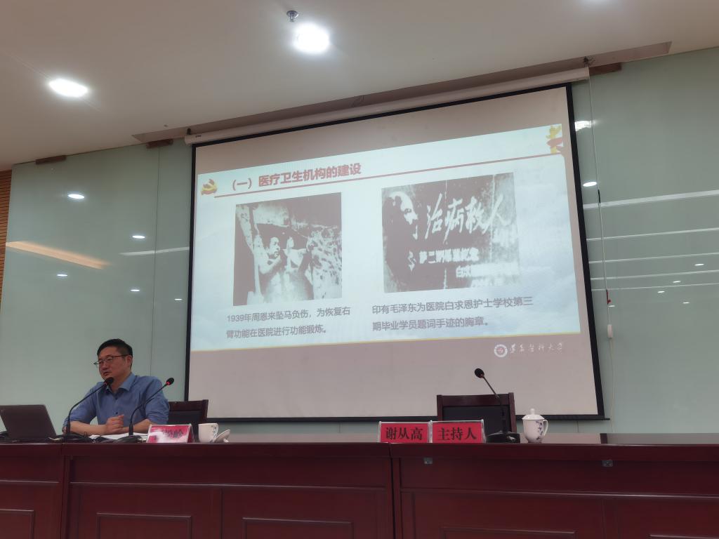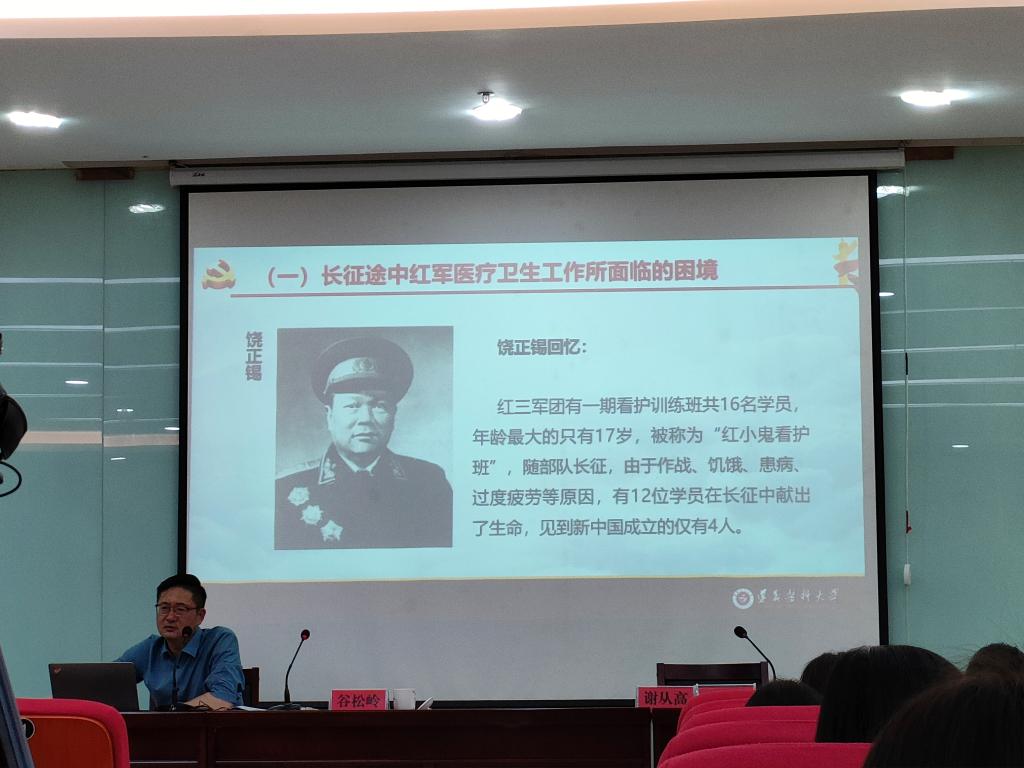 谷松岭从红医精神的内涵、红色医疗卫生的理论渊源、红军长征前的医疗卫生工作、红军长征中的医疗卫生工作、抗日战争时期的医疗卫生工作以及解放战争时期的医疗卫生工作等六个方面进行了深入细致的讲解和交流。