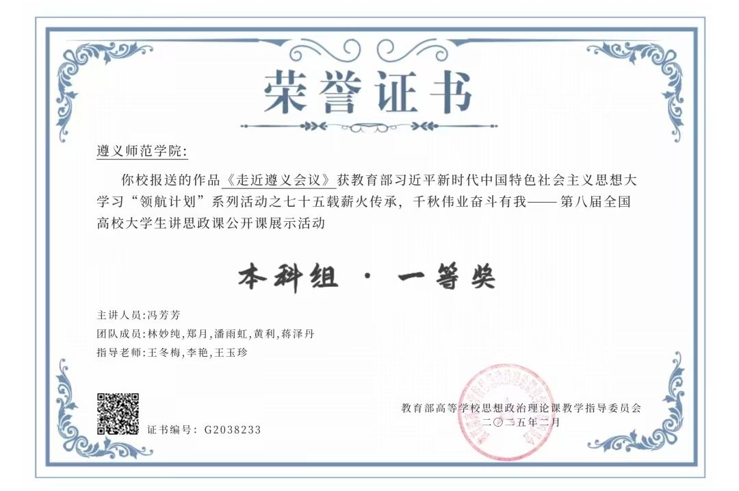 日前,在“七十五载薪火传承,千秋伟业奋斗有我”第八届全国高校大学生讲思政课公开课展示活动上,学校马克思主义学院学生冯芳芳主讲,马克思主义学院王冬梅、李艳、王玉珍三位老师指导的作品《走近遵义会议》喜获全国一等奖。